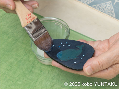 薄い青色で全体を染めます。このとき防染がきちんと出来ていないと色が入ってしまうので、かなり薄めた青色を革に塗って確認します。