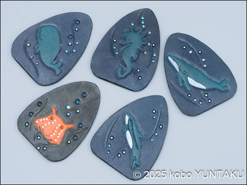 これまでつくってきたイルカ、ザトウクジラ、マッコウクジラ、タツノオトシゴも彫りました。裏側の革には波と泡のイメージで柄を彫ります。
