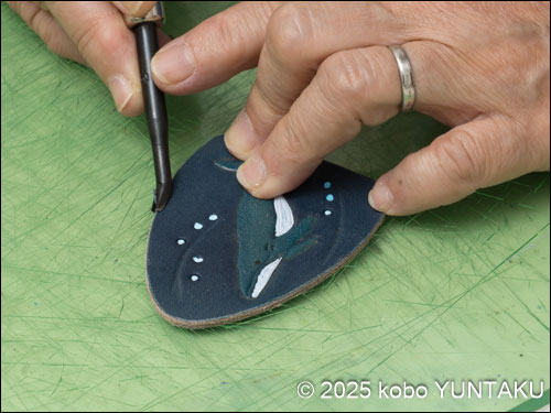 アクリル絵の具の白色でイルカ、ザトウクジラの腹部を色付けます。刻印で打った大小の丸部分にも同じようにアクリル絵の具で色付けすると、ようやく全ての色づけが終わります。